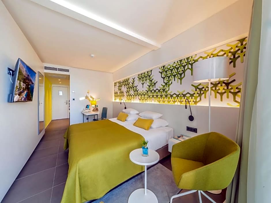 This double room features air conditioning, satellite TV and view. This room offers a terrace, a direct entrance to the swimming pool and it's located on the sea side.